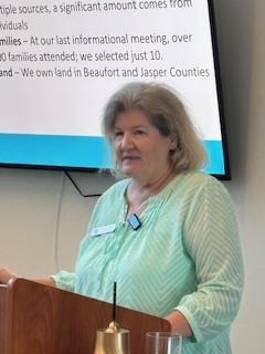 They currently have three houses under construction in Ridgeland, six houses are planned for land in Spanish Wells. They also have land in Beaufort and acreage in Hardeeville. Habitat's goal is to be creative to serve more families. Ms. Dooley explained the process to help insure that their recipients will be successful home owners. One of the components is that the mortgage is not move than 30% of income. There are four components of Habitat's Homeownership program - Volunteers, donors, families and land. Their newest neighborhood is Harvey Place in Hardeeville which consists of ten units in two buildings