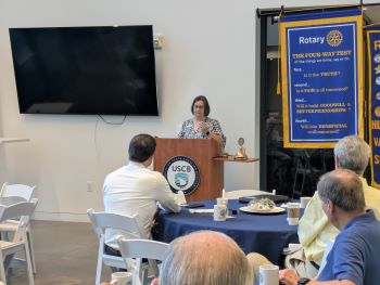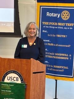 DG Sandy brought greetings from the RI President and had inspiring as well as challenging words for us. She encouraged us to be intentional and to think about collaborating with other area clubs. She encouraged us to do sonething special for World Polio Day, October 24 to increase awareness or even to raise funds to “End Polio Now” She covered the big three: Membership - consider doing a “Discover Rotary” function; Foundation - ½ comes back in 3 years - use Rotary Direct to donate; Public image - use press releases, social media. The District Conference will be held at the North Charleston Marriott. Be intentional, create, inspire, unite.